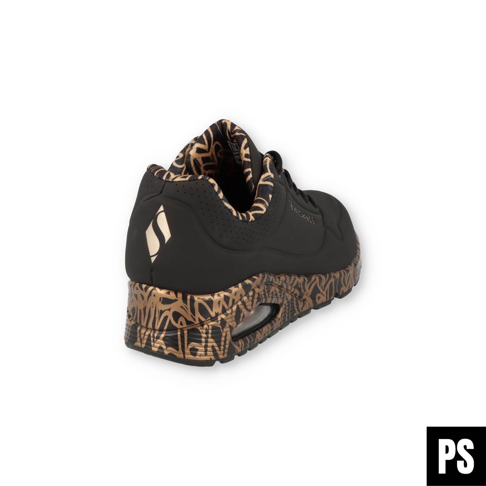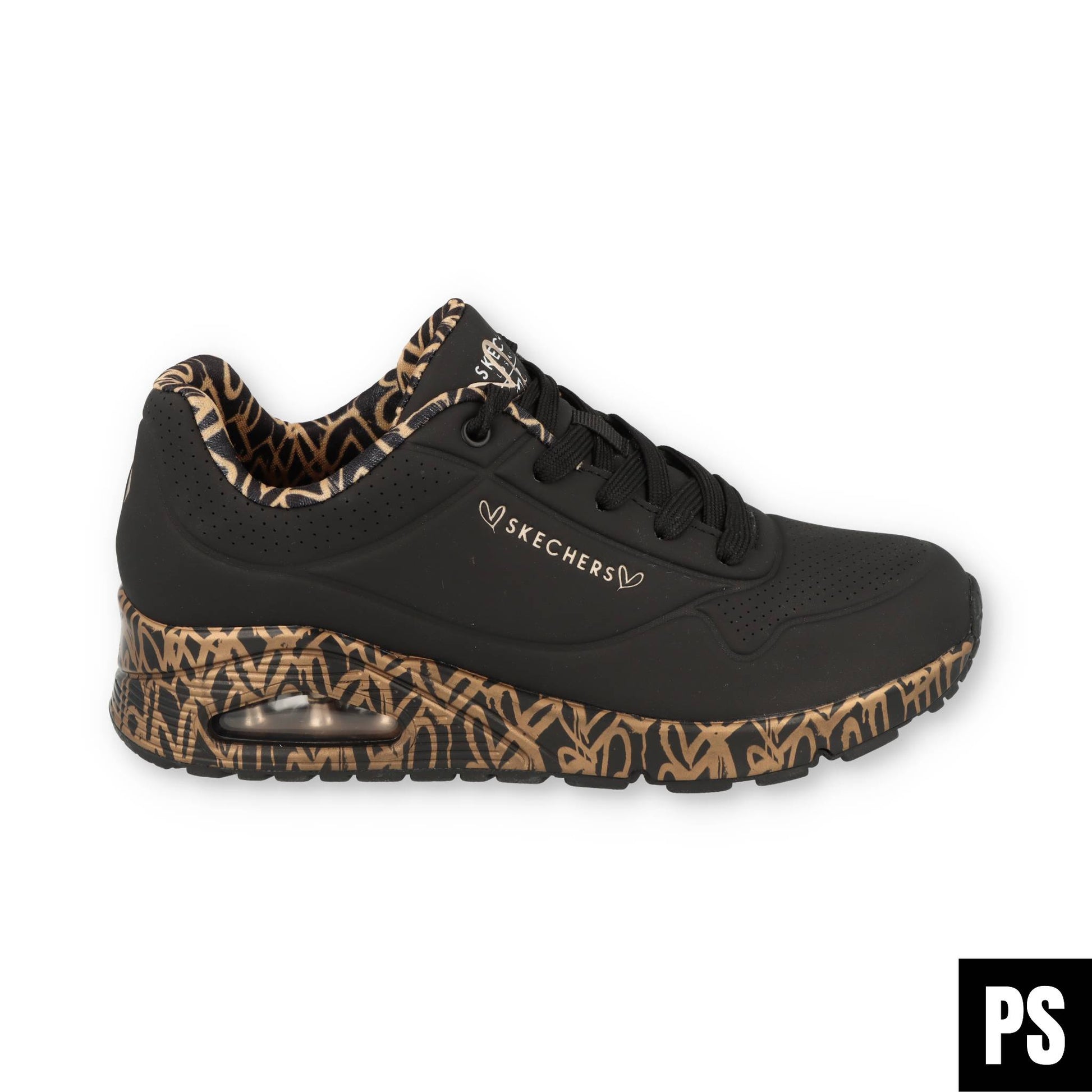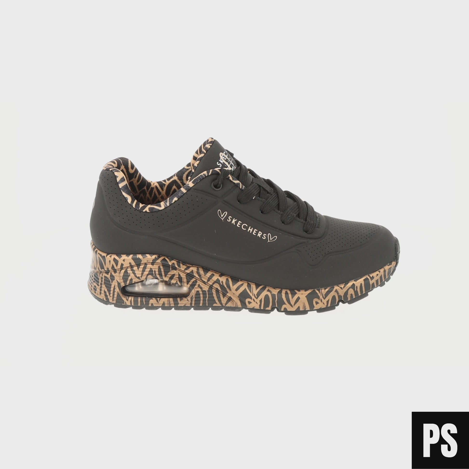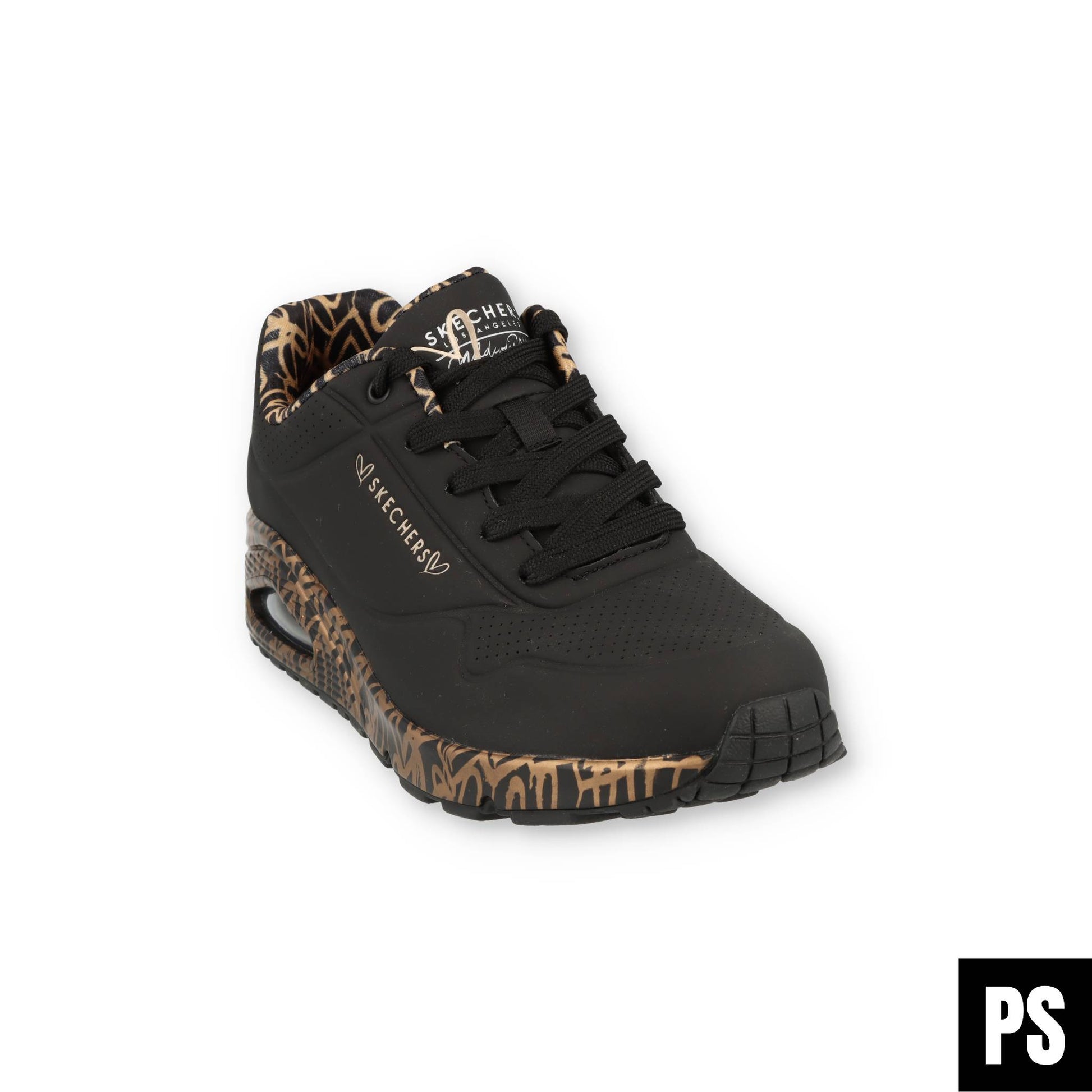 Mit dem Skechers Uno – Loving Love setzt du auf ein modisches Highlight. Das edle Schwarz wird durch die goldfarbenen Herz-Graffitis von Künstler JGoldcrown einzigartig in Szene gesetzt – ein Schuh, der sofort ins Auge fällt.