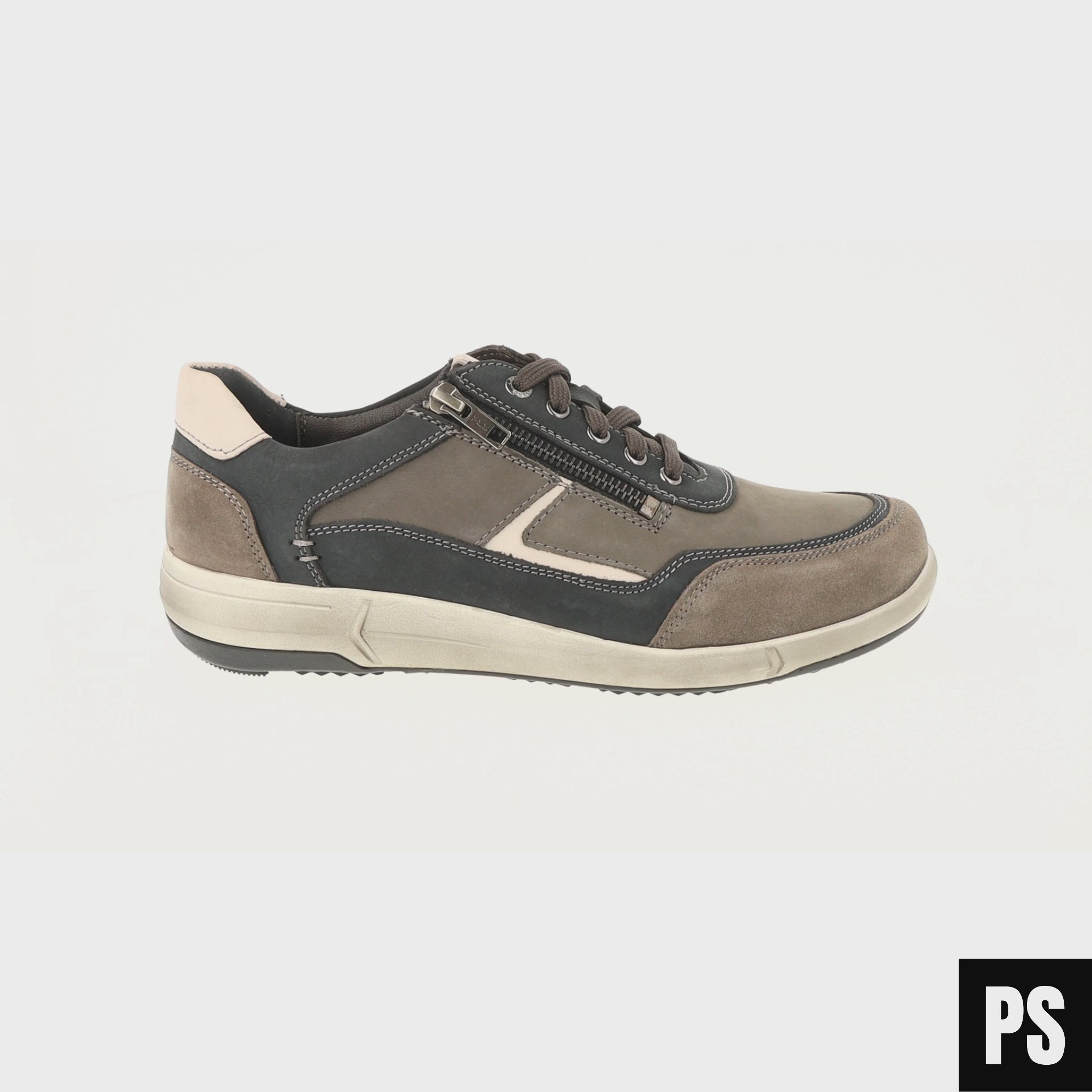 Ein Sneaker für Männer, die Komfort nicht dem Zufall überlassen. Der Enrico 33 verbindet sportliches Design mit durchdachter Funktion – perfekt für Alltag, Büro und lange Tage auf den Beinen.Die Kombination aus hochwertigen Lederarten in warmen Asphalt- und Brauntönen sorgt für einen modernen Look mit Charakter. Der seitliche Reißverschluss macht das An- und Ausziehen besonders bequem – ohne Schnürsenkel neu binden zu müssen.